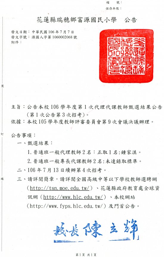 花蓮縣瑞穗鄉富源國民小學111學年度第2次公告普通班代理教師甄選第4次招考錄取公告