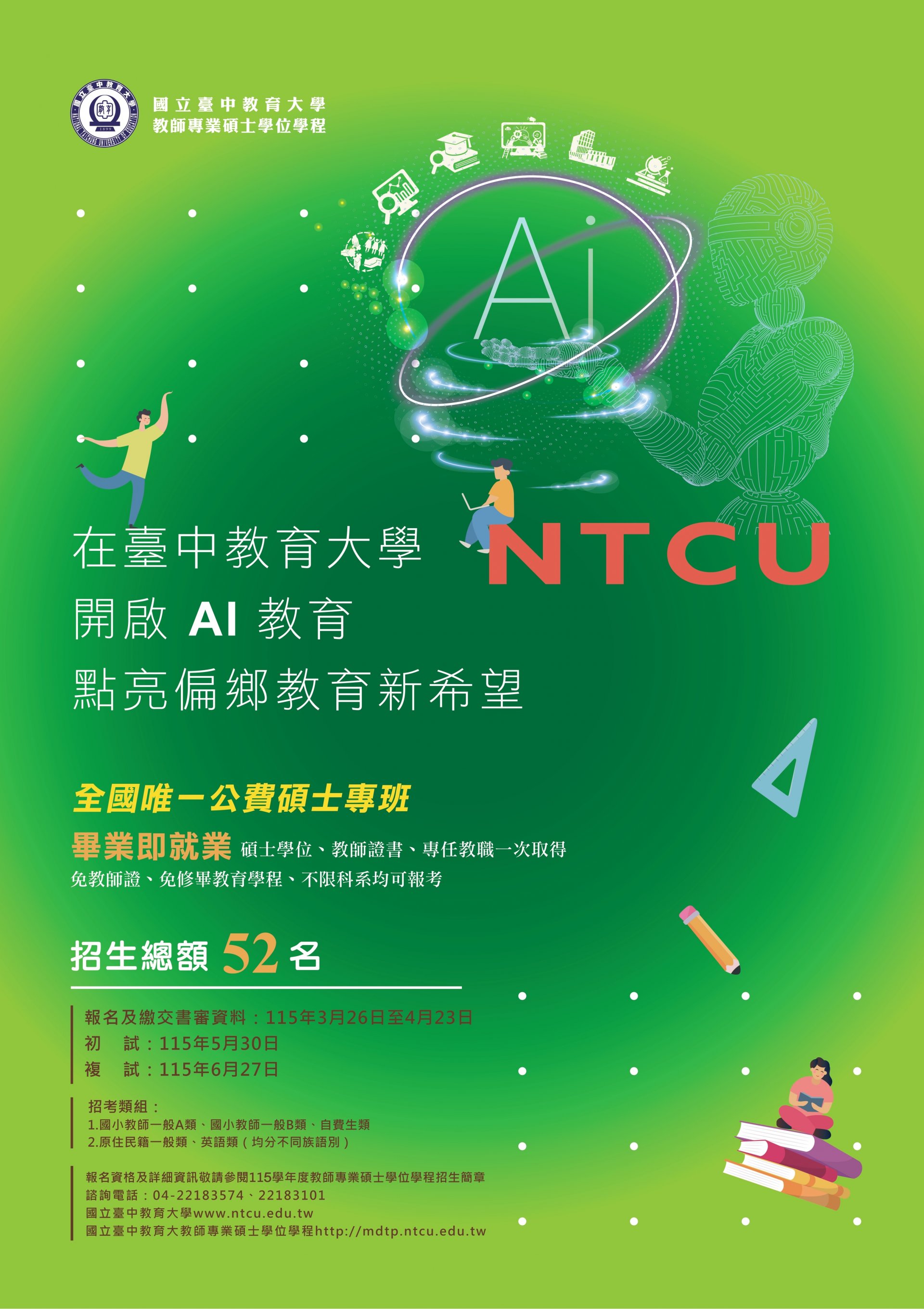 115學年度招生考試自115年3月26日至4月23日報名(含繳交書審資料),5月30日初試,6月27日複試,招生簡章請參閱本校招生資訊網(https://as.ntcu.edu.tw/