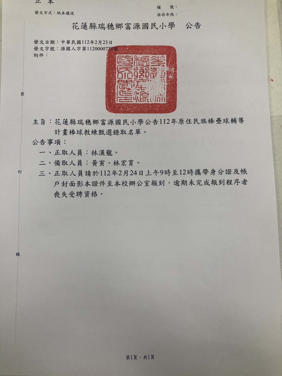 正取人員請於112年2月24日上午9時至12時攜帶身分證及帳戶封面影本證件至本校辦公室報到,逾期未完成報到程序者喪失受聘資格。