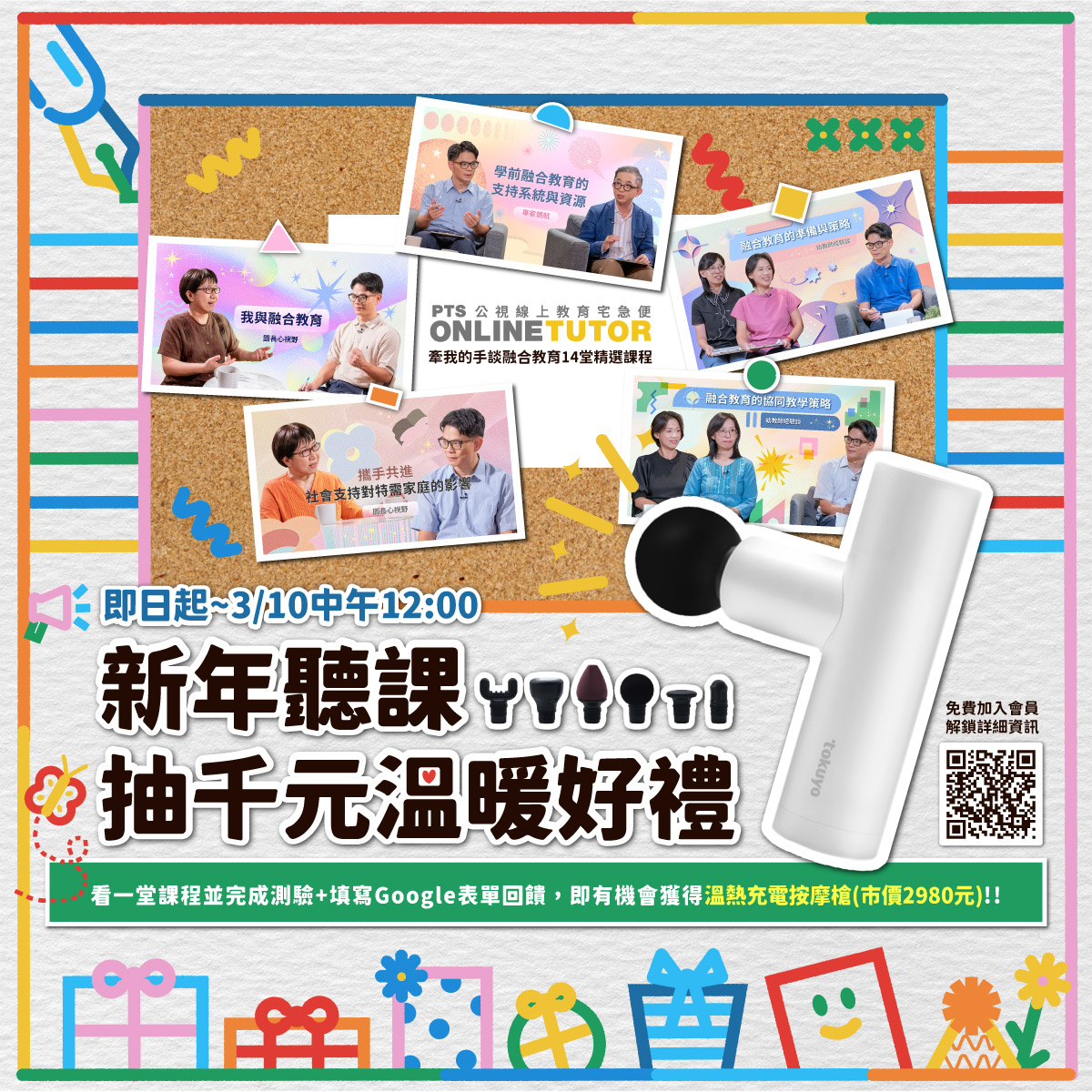 | 主旨: | 公視線上教育宅急便-教師研習平台「牽我的手,談融合教育」線上講座,聽課程拿研習時數、抽高級筋膜槍。惠請轉知貴校教師踴躍參加活動與修課,並請貴校(單位)公告周知。 |