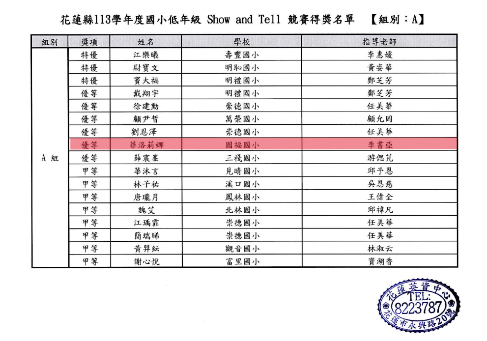 恭喜學生華洛莉娜參加花蓮縣113學年度國小低年級Show and Tell比賽榮獲~優等