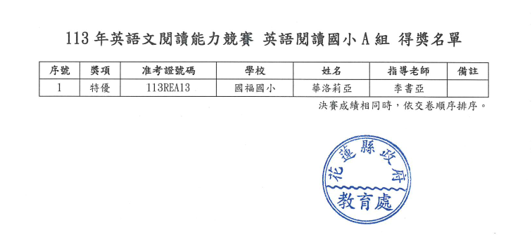 恭喜學生華洛莉亞參加花蓮縣113年度學生英語文閱讀能力競賽榮獲閱讀組~特優