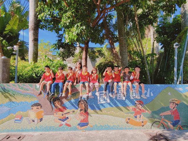 國福國小門面新氣象,趁著今天風和日麗的好天氣,校長召聚全校師生,介紹本校門口新完成的美麗牆面,並說明當初設計的內涵,好讓社區與學校間有更深刻的連結。結束後,各班分別合影,留下片刻的美好身影。