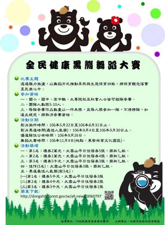 有關行政院農業委員會林務局東勢林區管理處舉辦之「全民健康黑熊舞蹈大賽」,請貴單位有意願者依附件說明報名參加,請查照。