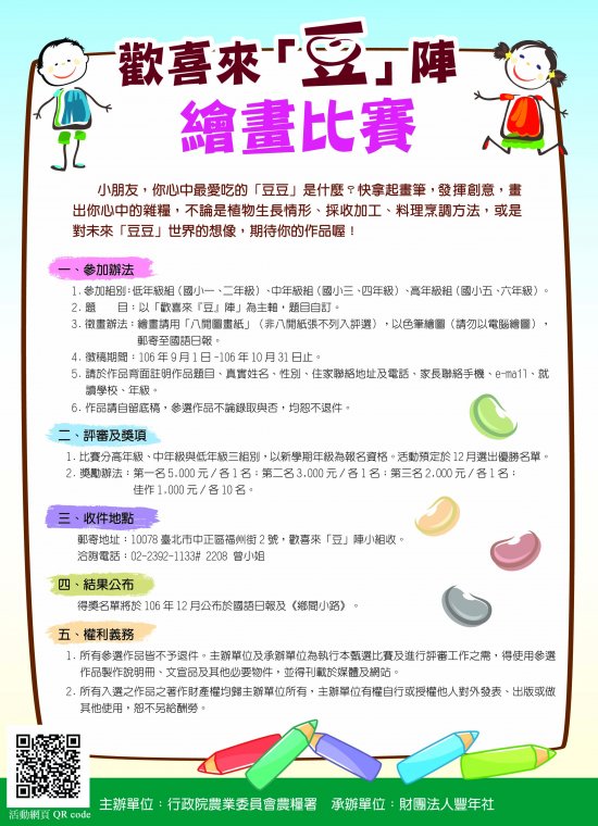 | 三、 | 「歡喜來『豆』陣 繪畫比賽」活動辦法詳如附件。可逕行以八開圖畫紙繪圖。作品收件至106年10月31日止。敬請 鼓勵學童踴躍為臺灣好「豆」創作宣傳。 |