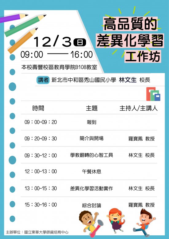 | 主旨: | 檢送本校教育與潛能開發學系羅寶鳳教授辦理「高品質的差異化學習工作坊」活動宣傳海報,請轉知並鼓勵所屬教師踴躍報名參加,請查照。 |