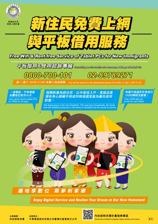 | 二、 | 旨案服務係提供新住民免費上網及平板借用,只要符合新住民身分者,撥打專線完成預約或至內政部移民署25個服務站申請,平板電腦即宅配到府,每月並享有10G網路流量;另若為中低收入戶或特殊境遇家庭或家中有身心殘障成員之新住民朋友,更能享有優先借用服務。 |