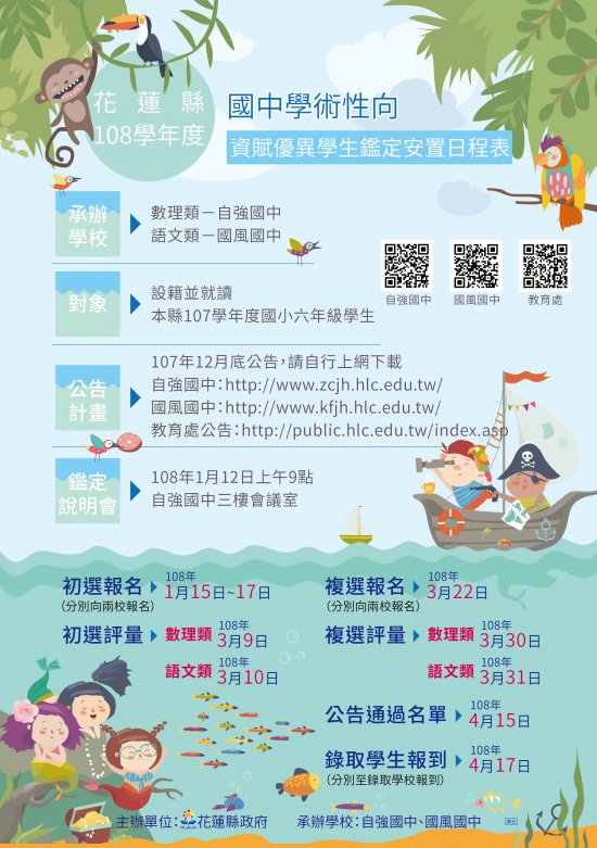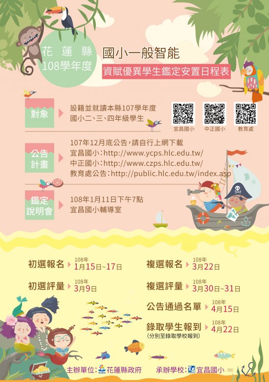 主旨:本縣108學年度國小一般智能資優學生鑑定及國中學術性向資優學生鑑定日程表將於近日以郵寄方式送達,請各校務必進行相關宣導,請查照。