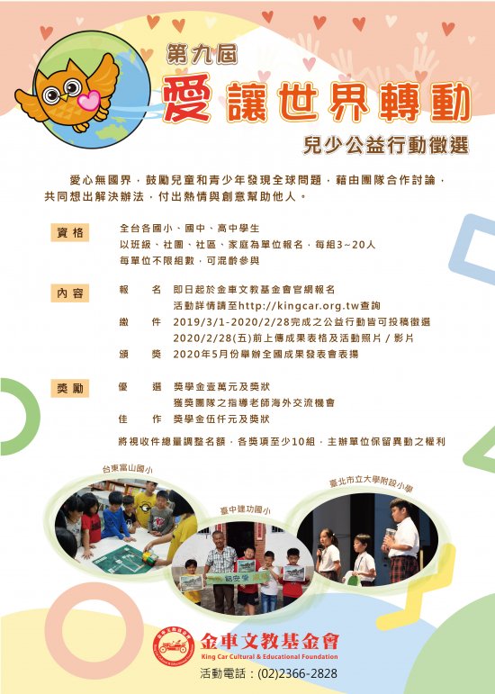 | 主旨: | 函請 貴校協助本會「愛讓世界轉動 兒少公益行動」2019第九屆徵選簡章訊息發布,敬請 惠允同意為荷。 |
