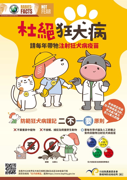 | 三、 | 本鎮亦屬狂犬病陽性地區,為降低疾病發生機率,遏止狂犬病之潛存感染,請宣導飼主帶家中犬貓(滿3個月齡)每年施打一劑狂犬病疫苗。 |