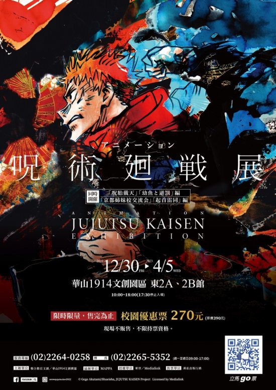 聯合數位文創股份有限公司訂於111年12月30日~112年4月5日於華山1914文創產業園區東2A東2B館舉辦「咒術迴戰」展,敬請協助公告周知,鼓勵師生及家長踴躍參與。