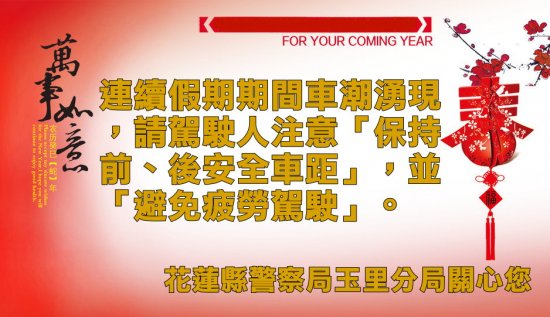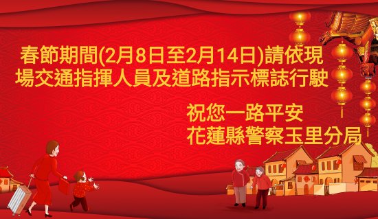 春節期間(113年2月8日起至2月14日止),請依現場警察人員指揮及道路指示標誌行駛,祝您一路平安。