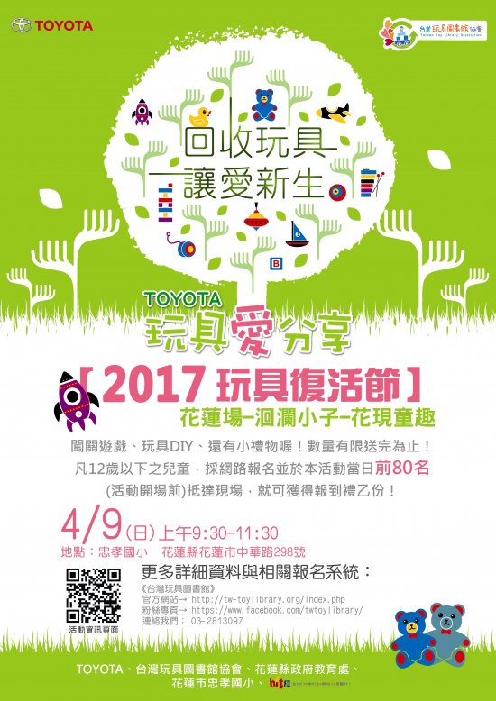 檢送台灣玩具圖書館協會辦理TOYOTA玩具愛分享「2017玩具復活節-洄瀾小子『花現童趣』」活動DM1份,請各校鼓勵師生及家長踴躍參加!