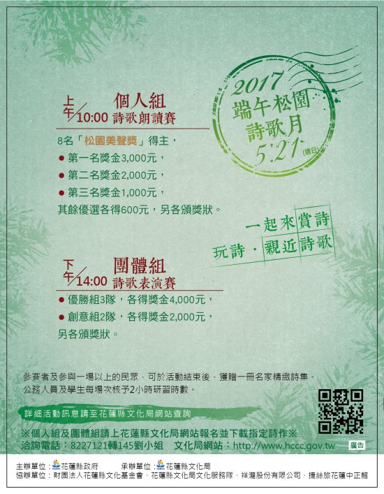 | 主旨: | 為慶祝端午節(詩人節),本局訂於106年5月21日(週日)假松園別館(地址:花蓮市松園街65號)小木屋辦理「106年端午松園詩歌月」活動,敬請貴單位轉知並鼓勵教職員生踴躍參加,至紉公誼。 |