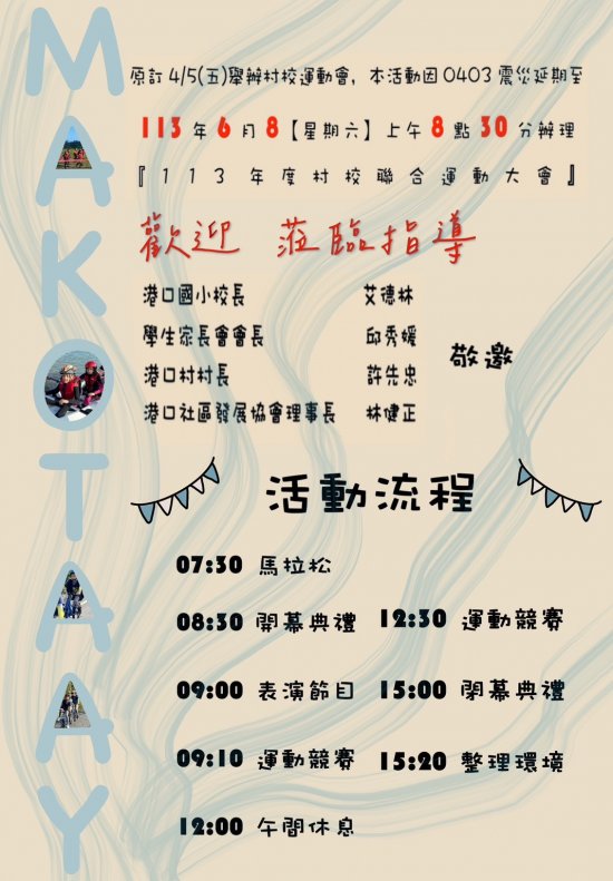 本校原訂4/5(五)舉辦村校運動會,因0403地震災情因素,經過會議討論後決定延期至6/8(六)辦理,敬請各位蒞臨指教,也歡迎港口部落村民好朋友們一同來歡聚!謝謝~~~