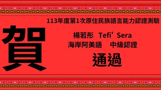 恭喜本校六年級學生Tefi' 楊若彤同學參加113年度第1次原住民族語言能力認證測驗,海岸阿美語中級認證合格~