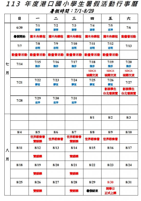 113年度港口國小暑假學生行事曆