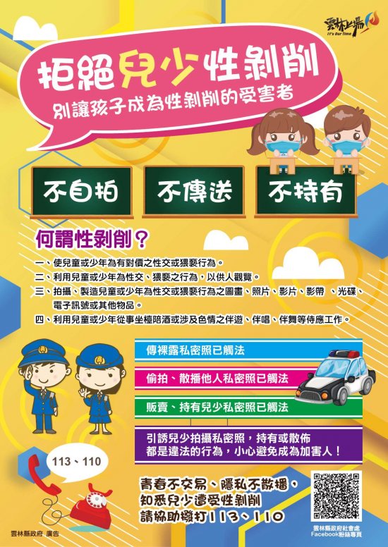 4. 網路世界停看聽,交友安全要注意,保護隱私,見面三思,發現兒少遭受受虐、性剝削、性侵害、網路性霸凌,檢舉專線113、110。