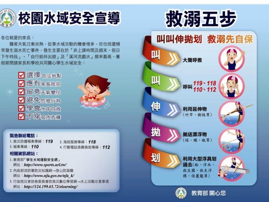 教育部籲請全國:務必在暑假前再次提醒學生水域安全的觀念,並將「救溺五步、防溺十招」主動向學生說明宣導,讓學生有一個平安健康的暑假。
