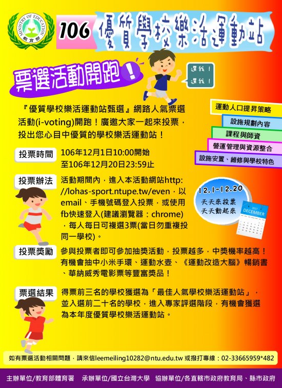 | 二、 | 體育署為表揚與推廣優質學校樂活運動站,今(106)年特別舉辦「學校樂活運動站甄選活動」,甄選活動共分為「學校甄選報名」與「網路票選」二個階段,第一階段「學校甄選報名」截至11月15日止已有42校報名參與,目前第二階段「網路票選」活動將於12月1日正式開始,「網路票選」活動歡迎各級學校師生、家長以及一般民眾共同參與,網路投票請上學校樂活運動站甄選活動網站(http://lohas-sport.ntupe.tw/event)。 |