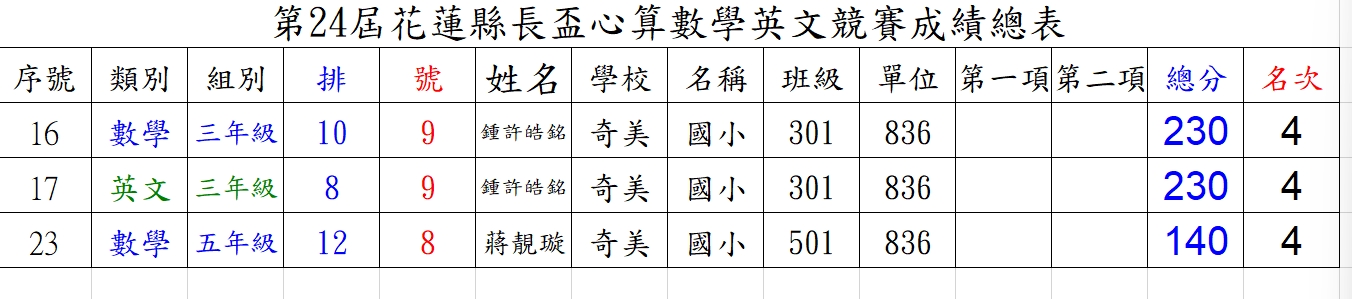 賀!本校學生參加第24屆花蓮縣長盃心算數學暨英文競賽,五年級蔣靚璇同學榮獲數學第四名、三年級鍾許皓銘同學榮獲英語第四名及數學第四名。