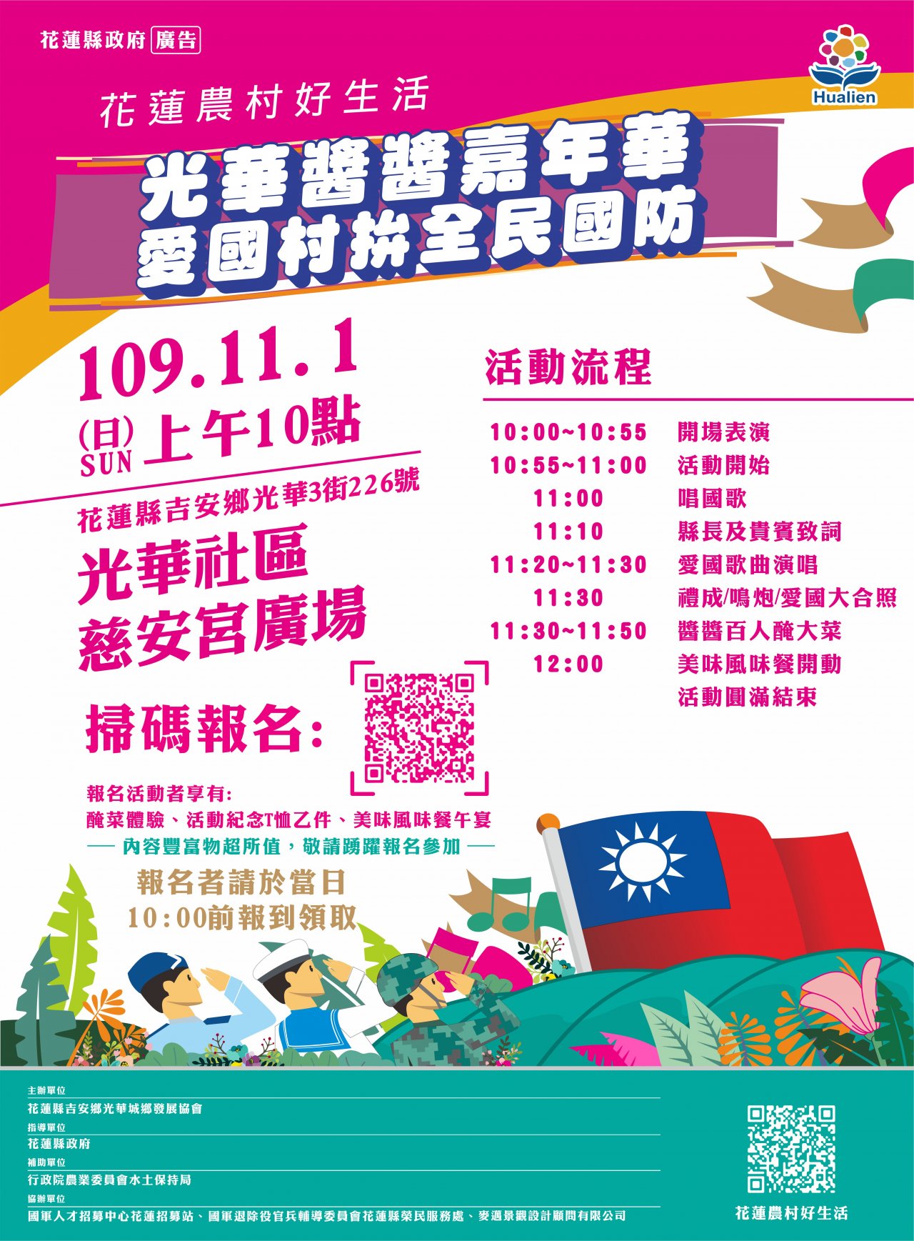 一、活動定於 109 年 11 月 1 日(星期日),假本縣吉安鄉光華 3 街 226 號慈安宮前廣場辦理,現場設置農村好生活打卡換獎 品、光華福利社販售在地農特產品、國軍人才招募中心花 蓮招募站有獎徵答及花蓮榮民服務處設服務攤位,嘉年華 活動內容包含社區活動表演、花蓮招募站三軍人型氣偶 舞、國歌大合唱及愛國歌曲演唱,歡迎大朋友小朋友一起 同樂,支持在地農民及農村再生發展,結合落實全民國防 教育。