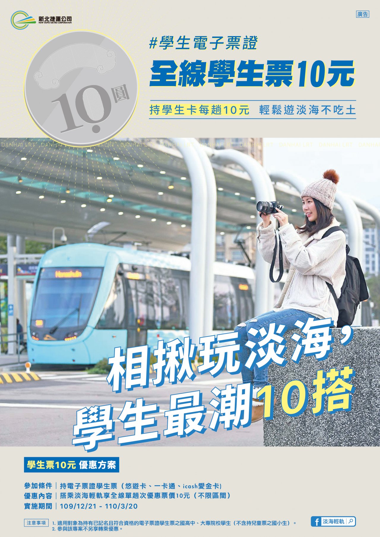 「淡海輕軌學生 10 元方案」活動摘述如下: (一)活動期間: 109 年 12 月 21 日起至 110 年 3 月 20 日止。 (二)活動內容:全國大專院校及國、高中學生憑學生電子票 證即可以單程均一價 10 元的優惠價體驗輕軌。