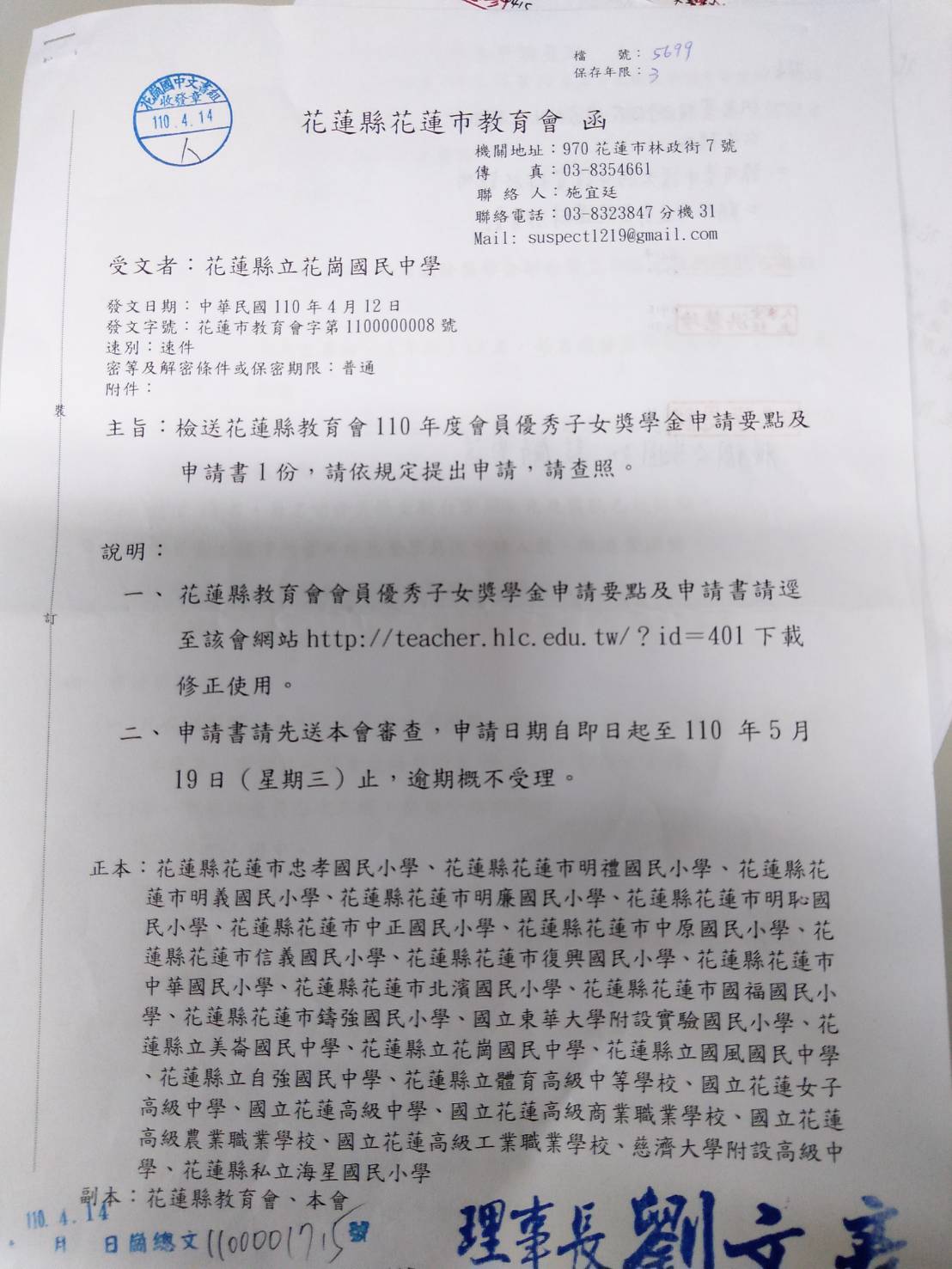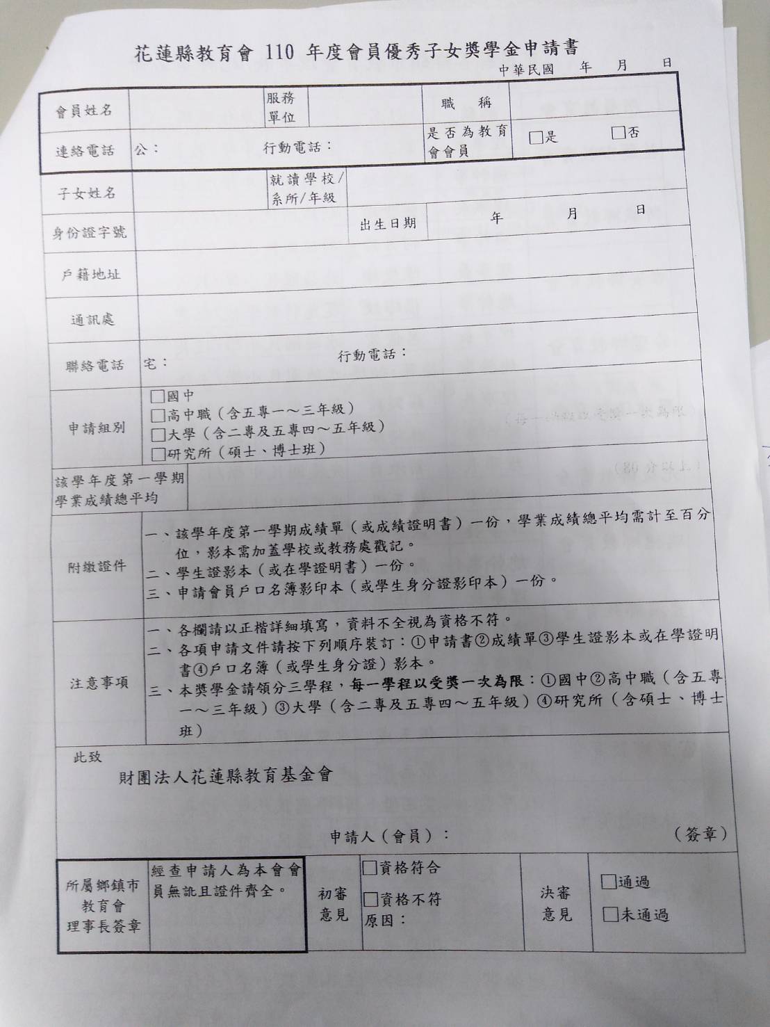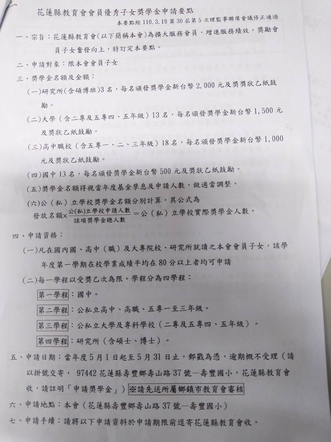 請符合條件者將申請資料逕寄花蓮縣教育會,並自行留意得獎名單公告(110816日公布於花蓮縣教育會網站)及獎金請領日期。詳下檔案,謝謝。