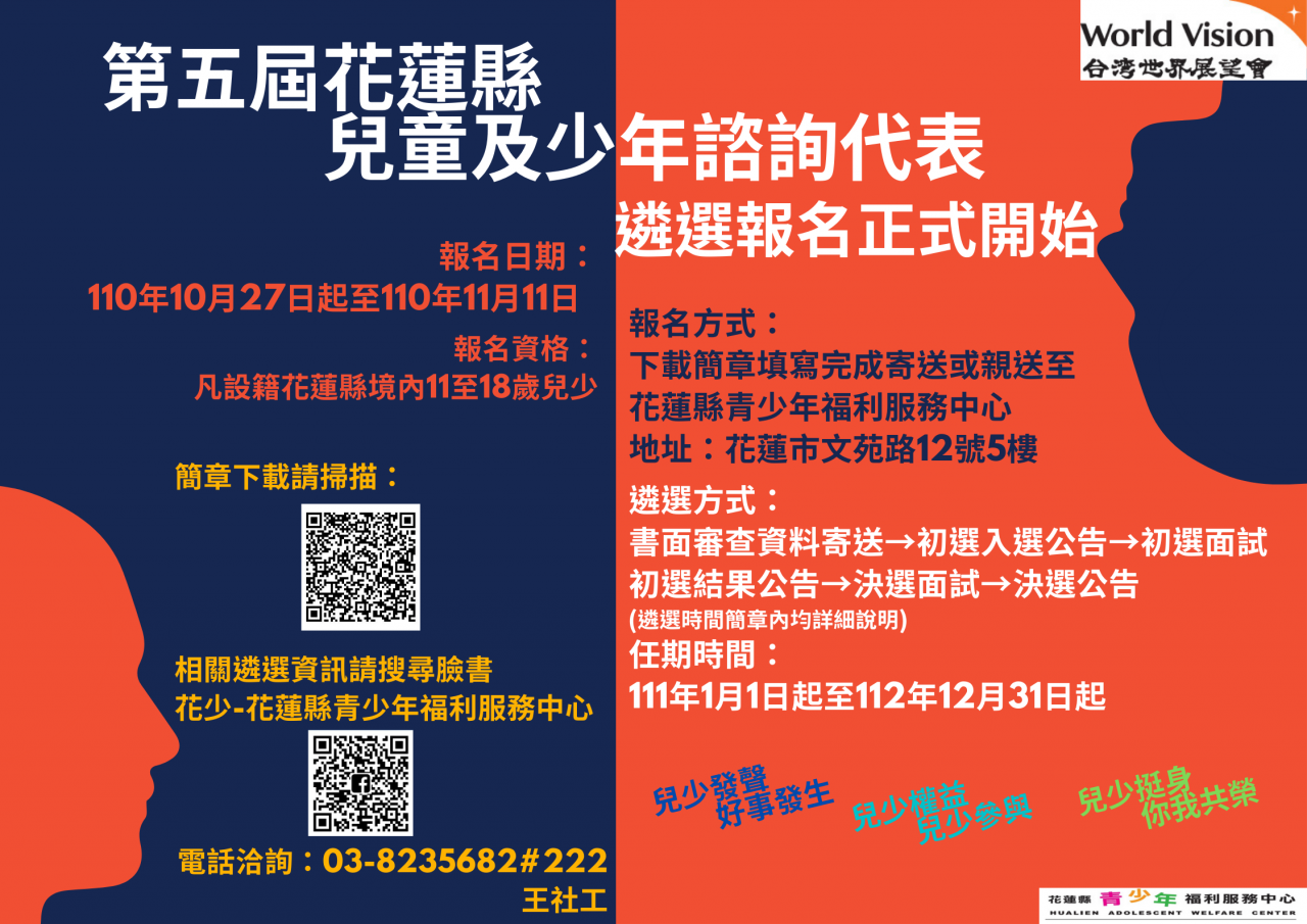 一、為彰顯兒少權益發聲角色,並推動本府重視兒少參與公共 事務及公民權利,本府委託財團法人台灣世界展望會辦理 本縣兒少諮詢代表培力計畫。 二、本次遴選報名時間至 110 年 11 月 11 日,報名對象為 11-18 歲 之兒少,其他報名相關資訊及兒少諮詢代表相關權利與義 務詳見報名簡章。 三、本案承辦窗口為本縣青少年福利服務中心;聯絡人為王鈞 弘社工,電話:( 03 ) 823-5682#222 。