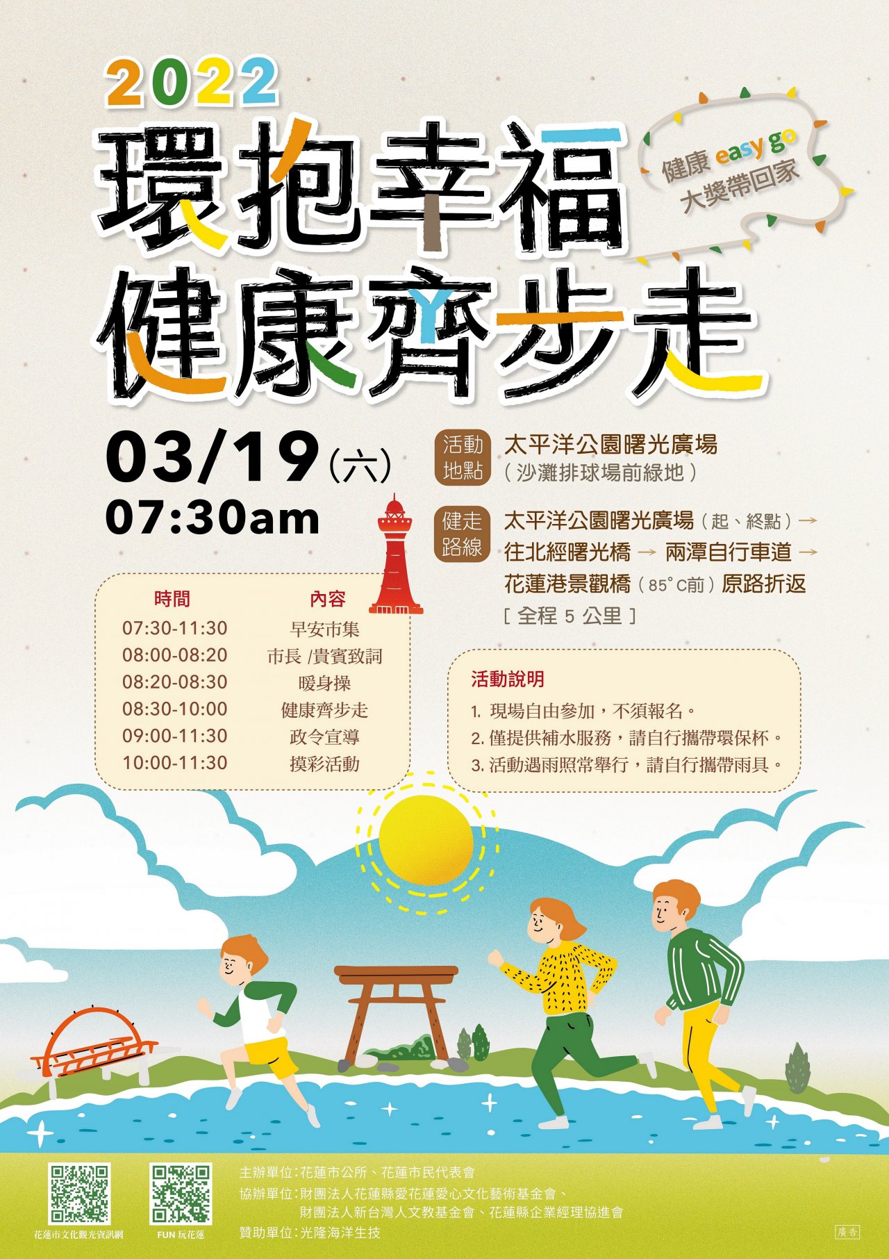 一、本活動係為培養市民運動風氣,提升戶外運動意願,藉由 舉辦健走活動,提供市民聯絡家庭情感,享受與家人、朋 友一起在自然清新的空氣下運動的健康生活,增進身體機 能。 二、活動資訊 (一)時間: 111 年 3 月 19 日(週六)上午 7 時 30 分。 (二)地點:太平洋公園曙光廣場(北濱沙灘排球場前綠 地)。 (三)更多活動資訊請至花蓮市文化觀光資訊網查詢 ( https://reurl.cc/X4a4V7