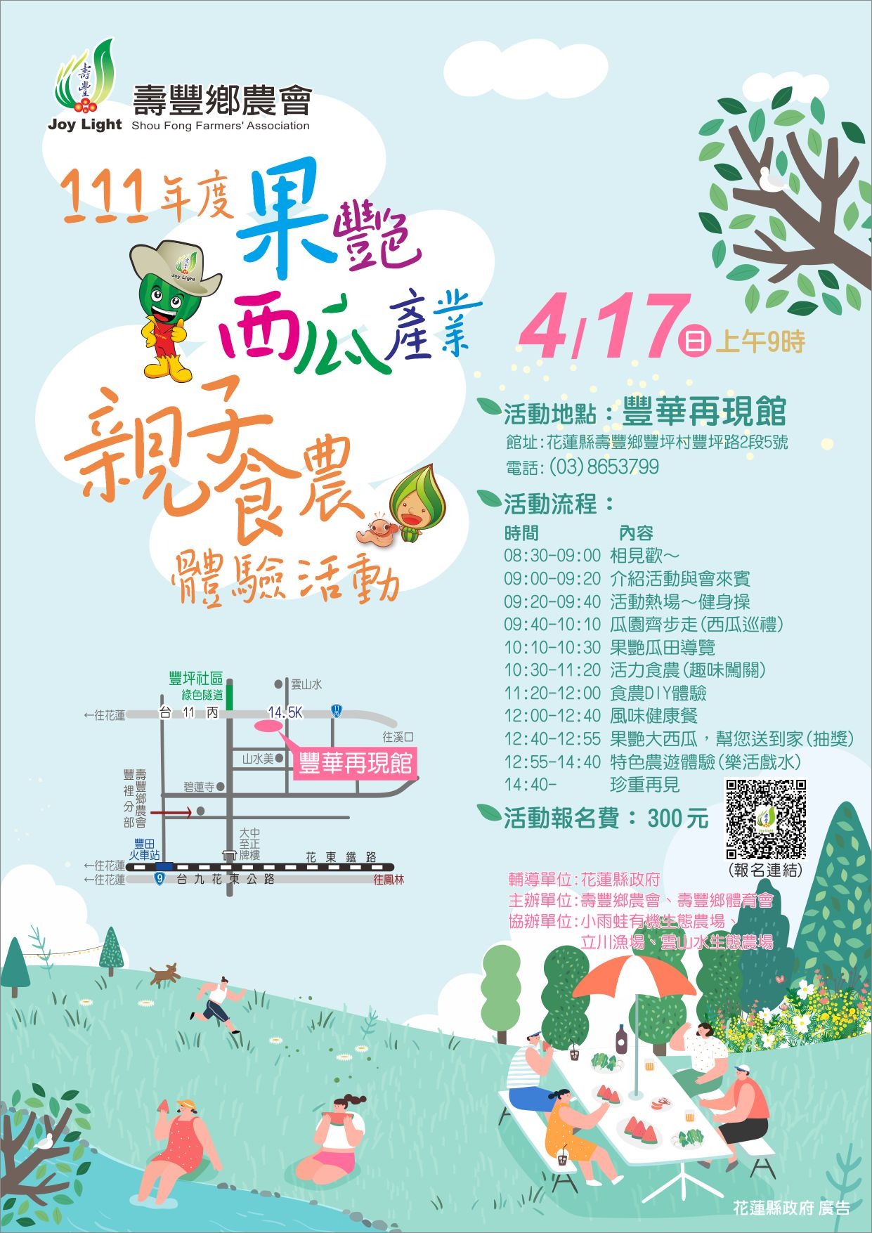 活動內容詳如附件 DM ,報名專線:壽豐鄉農會推廣部 03-8653799 、 03-8652167 ;報名網址: https://forms.gle/XhavoexAWkikxrzp9 ;報名傳真: 03-8650717 。