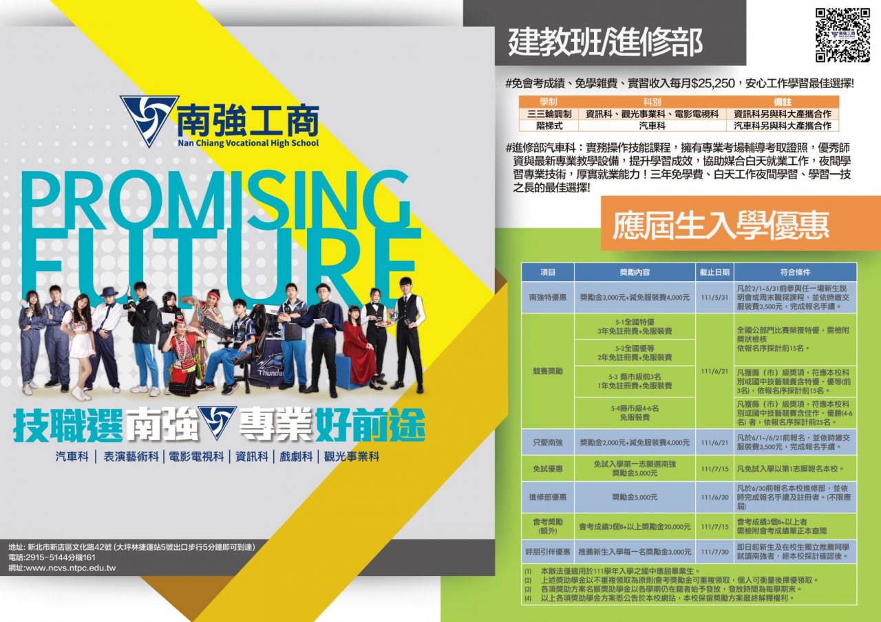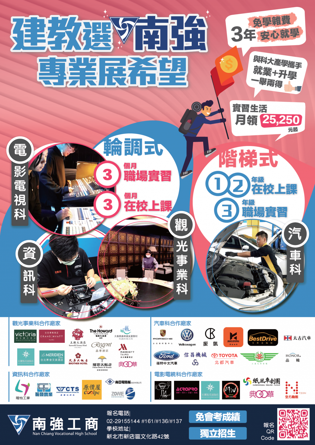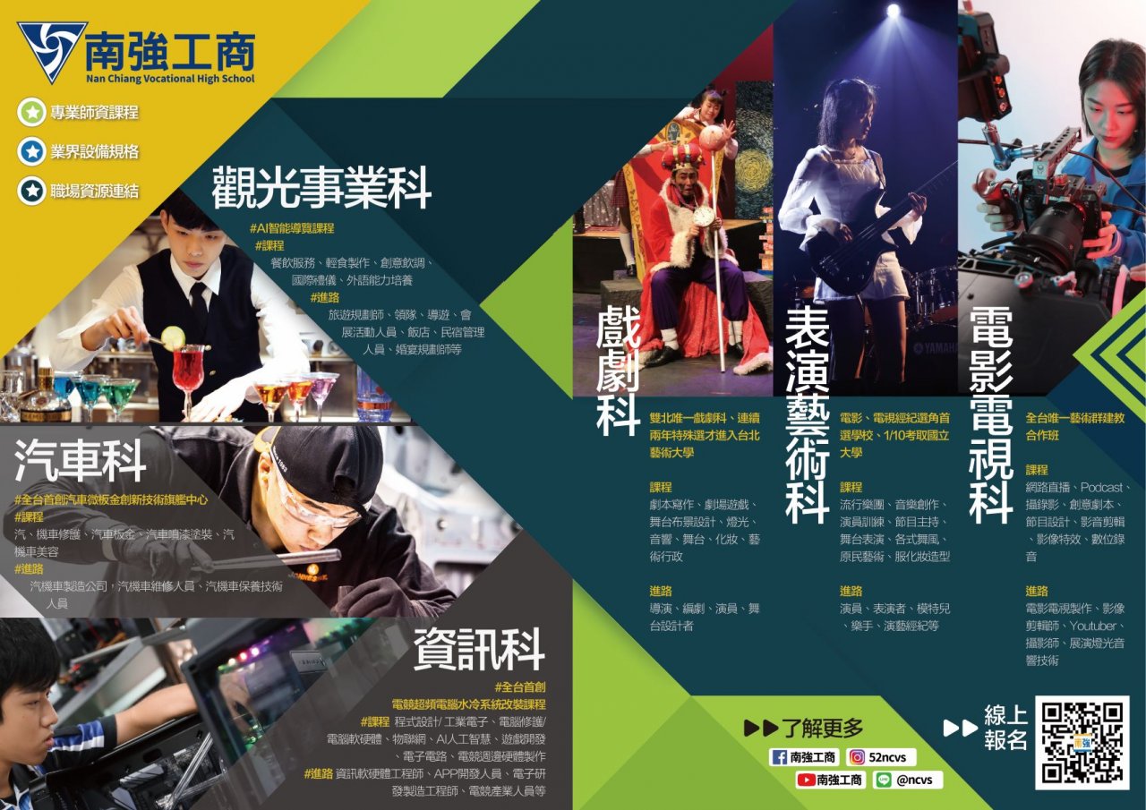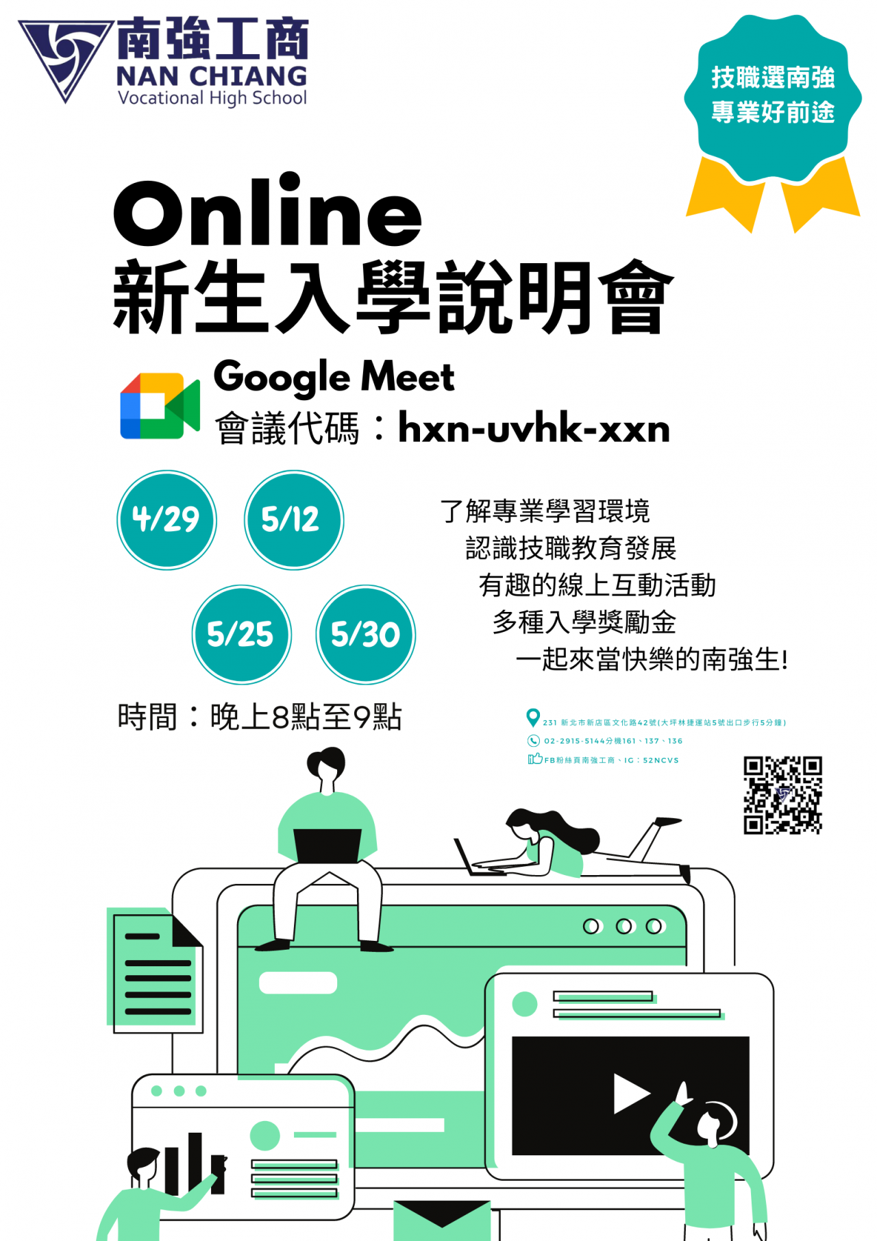 | 三、 | 課程主題:認識技職教育、專業設施線上導覽與親師生意見交流,想要了解技職教育的國中學生及家長(不限年級),可直接掃描附件海報上的 Qrcode ,線上報名參加。 |