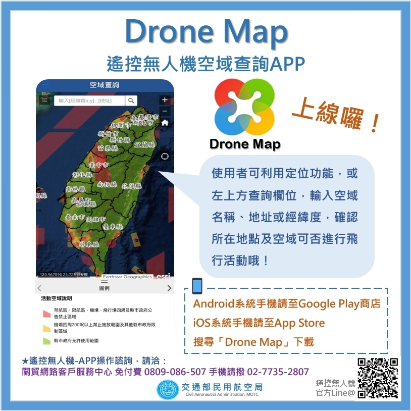 一、依據交通部民用航空局花蓮航空站 111 年 4 月 25 日蓮航字第 1115000804 號函辦理。 二、本案宣導重點如下: (一)機場四周禁止施放有礙飛航安全物體。 (二)機場四周及公告區域禁止從事遙控無人機飛航活動。 三、民航法遙控無人機專章自 109 年 3 月 31 日施行,民航局已彙 整遙控無人機圖資資料,並匯入「遙控無人機管理資訊系 統」,另已建置行動裝置應用程式( DroneMap ),搭配地 理定位功能,可提供無人機操作者查詢利用。