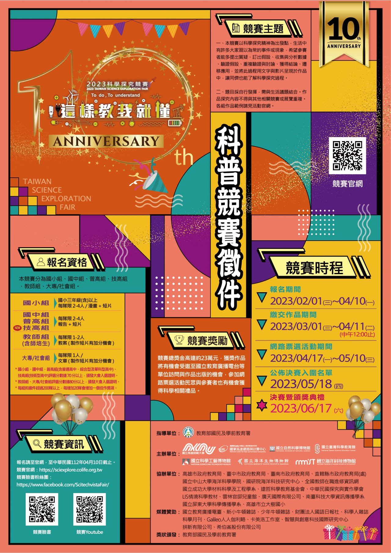| 二、 | 為提升國內科學素養,培養學生對科學探究能力,舉辦 2023 年「科學探究競賽-這樣教我就懂」科學競賽活動,本活動指導單位為教育部國教署、國立高雄師範大學、國家實驗研究院,共同主辦單位為國立自然科學博物館、國立海洋生物博物館、國立海洋科技博物館及國立臺灣科學教育館、國立科學工藝博物館及國家高速網路與計算中心,並由國立高雄師範大學與南台科技大學承辦旨揭活動。 |