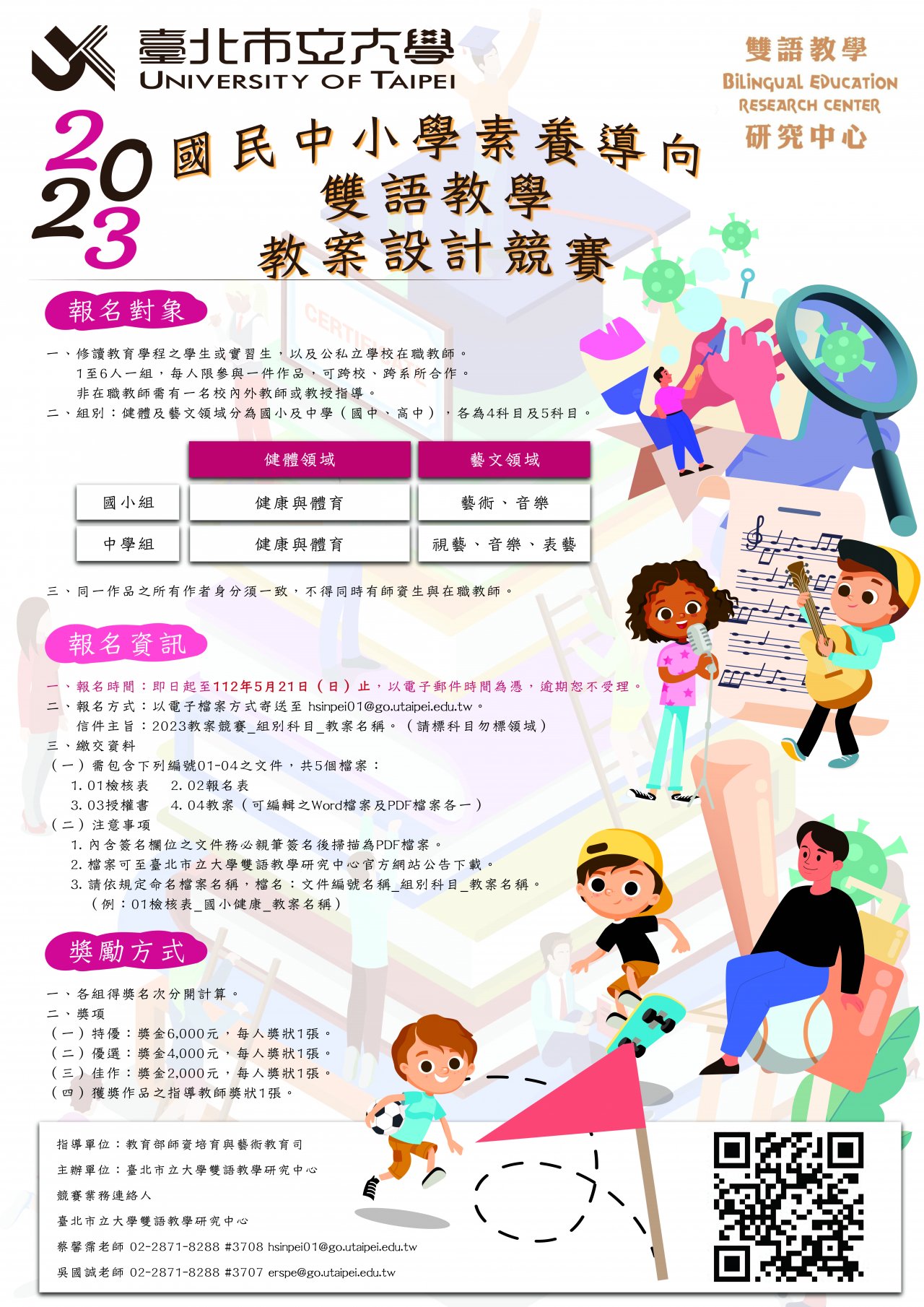 五、 競賽連絡人:臺北市立大學雙語教學研究中心 蔡馨霈教師 (02)2871-8288#3708 或 hsinpei01@go.utaipei.edu.tw 。