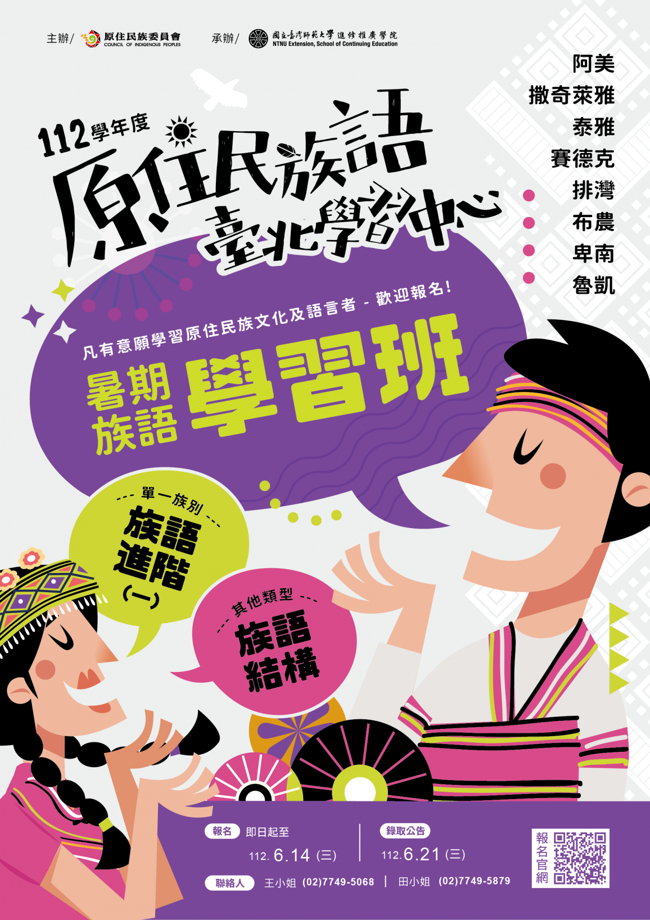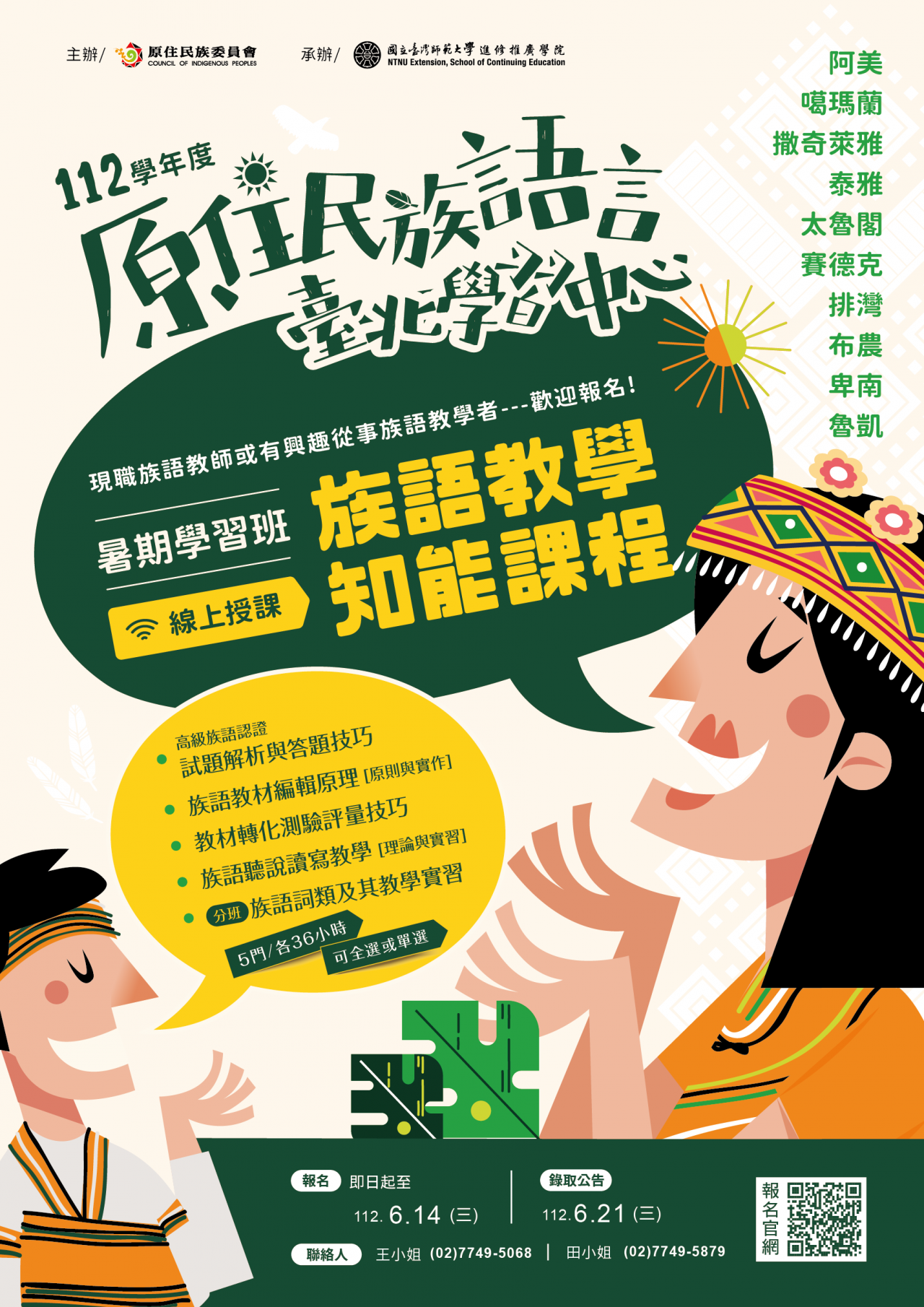 | 三、 | 旨案招生對象針對有意從事阿美族、噶瑪蘭族、撒奇萊雅族、泰雅族、太魯閣族、賽德克族、排灣族、布農族、卑南族、魯凱族等族語教學或語言推動工作者。 |
