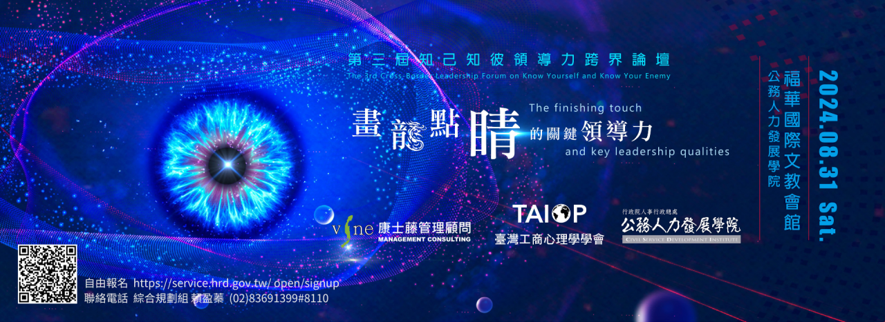 檢送行政院人事行政總處公務人力發展學院與康士藤管理顧問公司及臺灣工商心理學學會( TAIOP )共同主辦「2024 第三屆知己知彼領導力跨界論壇─畫龍點睛的關鍵領導力」之實施計畫及宣傳橫幅各 1 份,請於報名期限前完成線上報名作業,轉請查照。