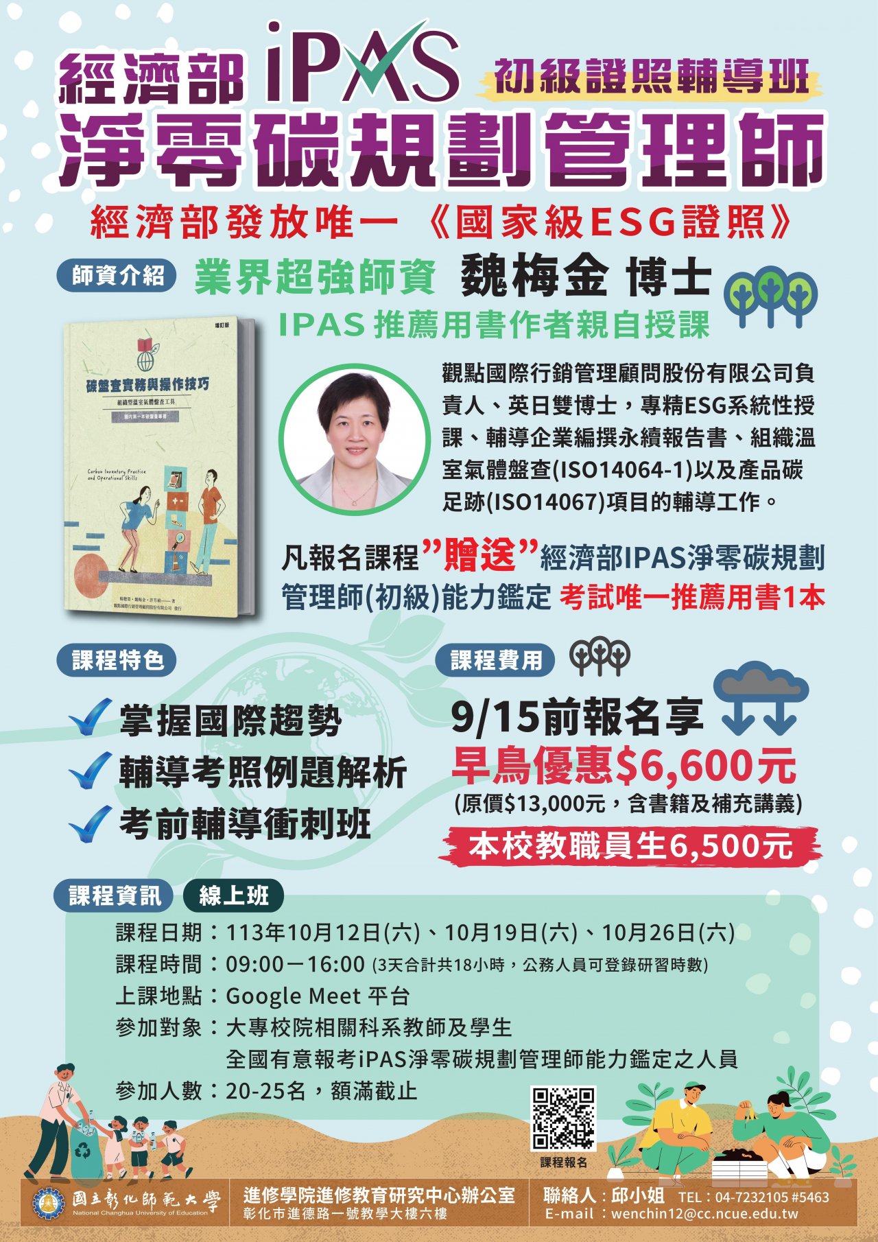 檢送本校進修學院推廣教育「113 年 iPAS 淨零碳規劃管理師(初級)能力鑑定輔導班 (線上班) 」招生簡章,敬請惠予公告,並鼓勵相關人員報名參加,請查照。