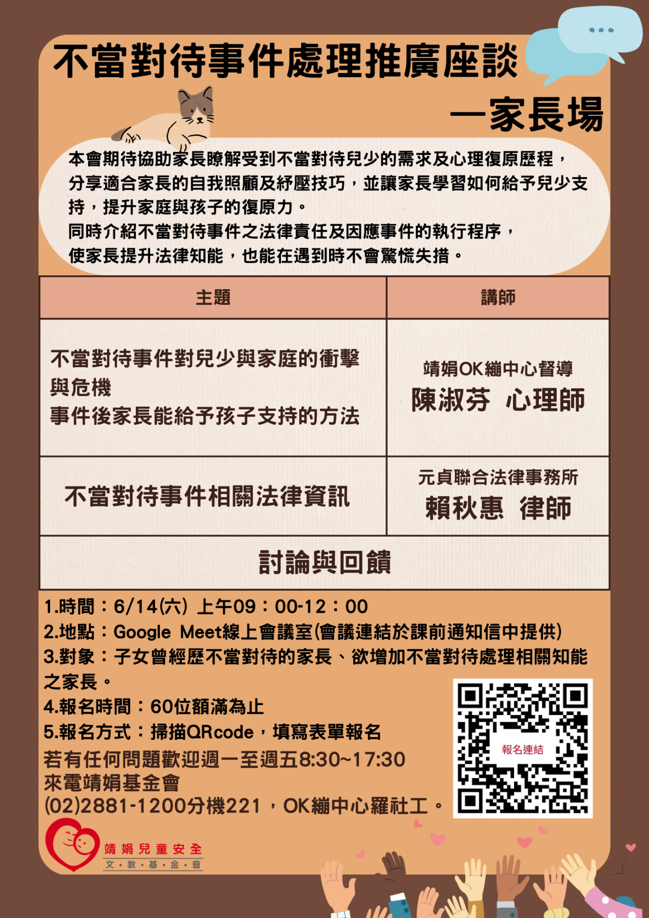| 主旨: | 函轉財團法人靖娟兒童安全文教基金會 OK 繃兒童服務中心擬於 114 年 6 月 14 日辦理「不當對待事件處理推廣座談—家長場」,詳如說明。 |