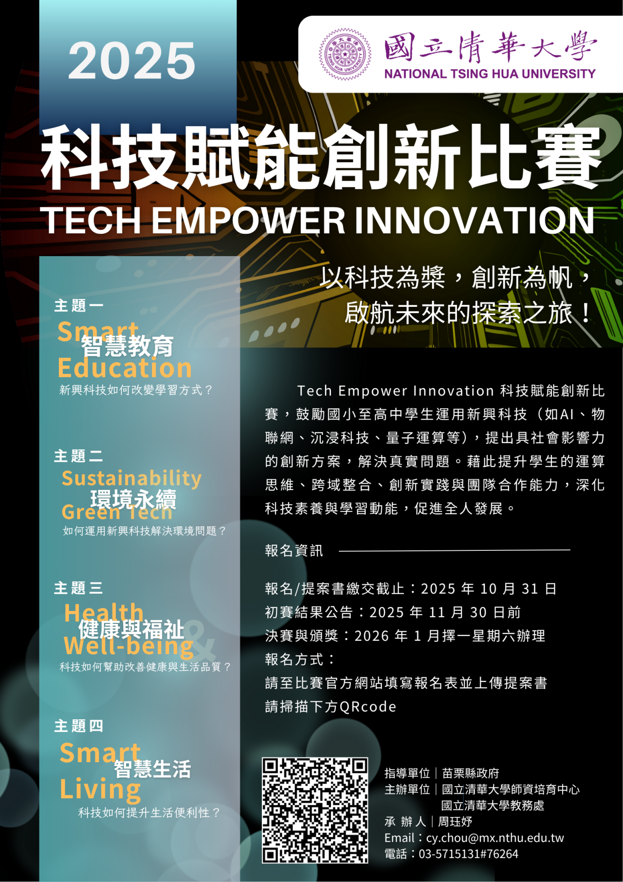 | (四) | 活動詳情請參閱比賽官網: https://steam-miaoli.site.nthu.edu.tw/p/406-1616-292974,r11470.php 。 |