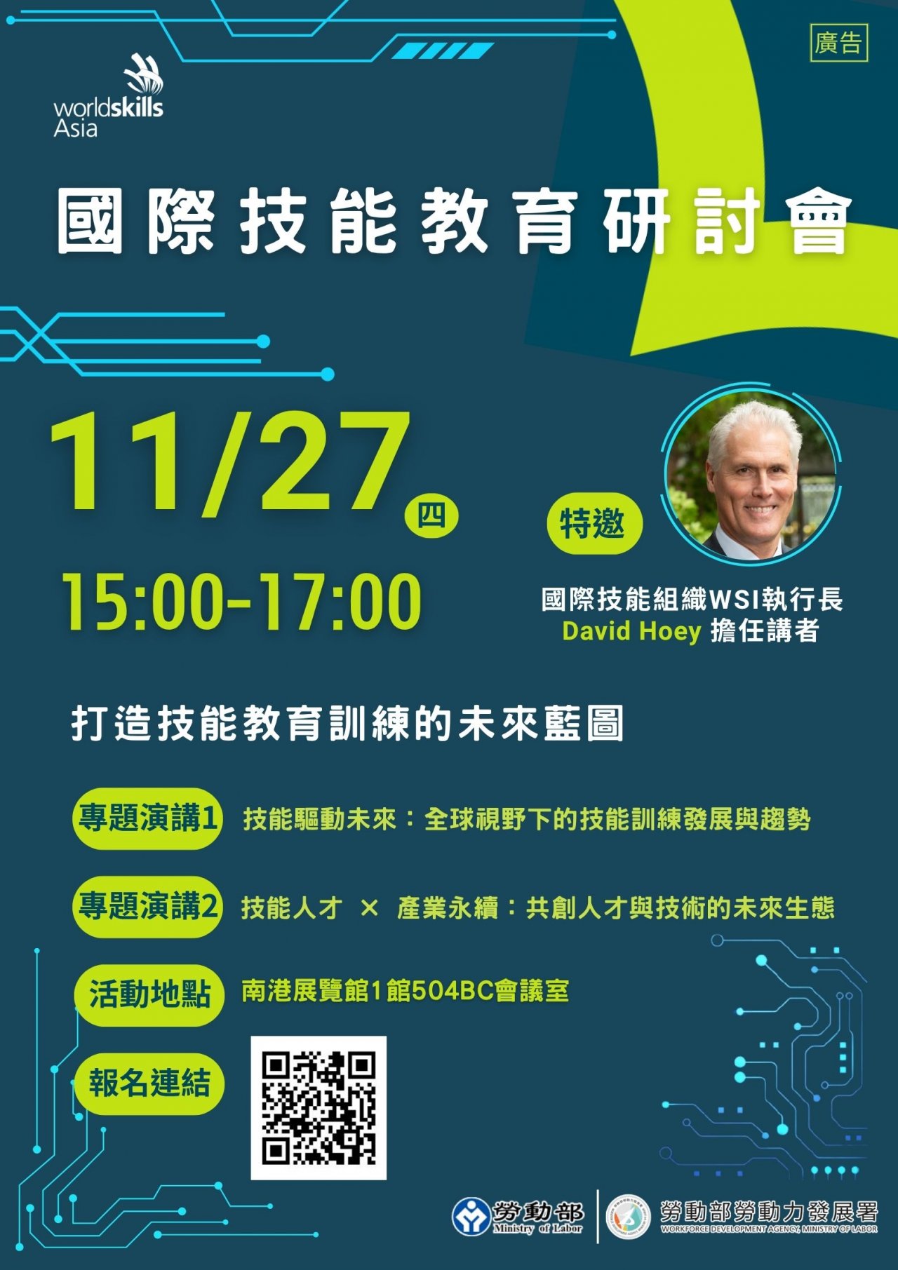 | 二、 | 2025 亞洲技能競賽訂於 114 年 11 月 27 日(星期四)至 11 月 29 日(星期六)假臺北南港展覽館舉辦。國際技能教育研討會係 2025 亞洲技能競賽之重要周邊活動之一,為推動技能教育國際交流,勞動部勞動力發展署訂於 114 年 11 月 27 日(星期四) 15 時至 17 時假南港展覽館 1 館 504BC 會議室辦理該研討會,匯聚來自產官學界之專家與代表,期促進技能與職業教育訓練( TVET )領域之深度交流與國際合作。 |