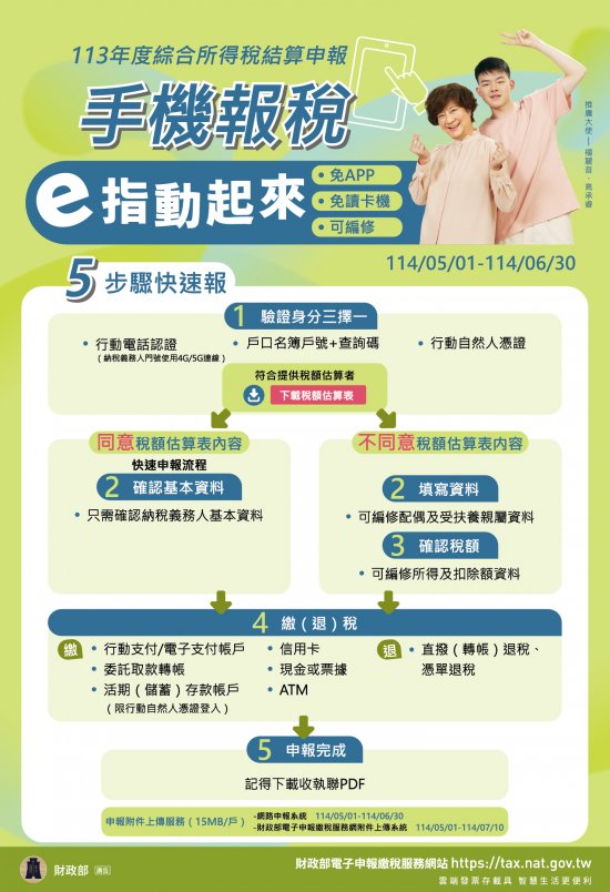 2025-05-01 提醒 113年度綜合所得稅結算申報期間為114年5月1日至6月30日,請協助宣導及轉知所屬同仁儘早於申報期間辦理綜合所得稅結算申報,多加利用網路(含手機)報稅,申報便利又安全,請查照。