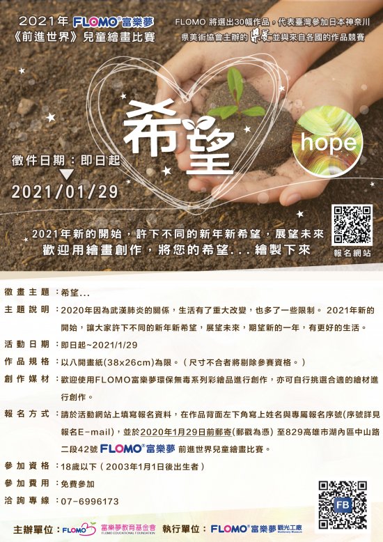 3.報名方式:請於活動網站上 https://www.beclass.com/rid=2443f075fe2b4f8bb520 填寫報名資料,在作品背面左下角寫上姓名與專屬報名序號(序號請詳見報名E-mail),並於2021年1月29日前郵寄(郵戳為憑) 至 829高雄市湖內區中山路二段42號FLOMO富樂夢前進世界繪畫比賽。