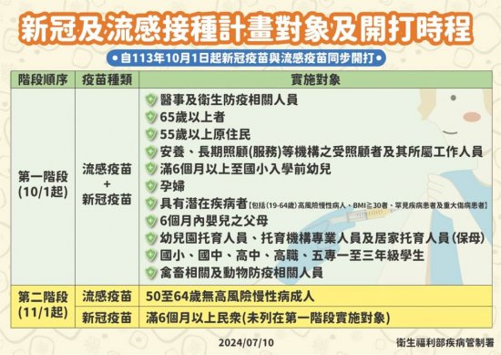 四、 為避免幼兒及學生感染新冠病毒後,造成的身體不適,影響課業學習,甚至出現重症及死亡風險,全國自113年10月1日起同流感疫苗分階段開放接種,同年11月1日起開放滿6個月以上全民接種(接種對象及時程如附件1)。