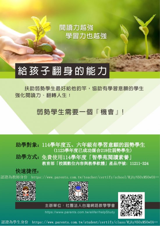 五、 敬請貴校協助提報114學年度五、六年級家境清寒且有學習意願的弱勢學生,就能免費使用「114學年度智學苑閱讀素養」,家境清寒的認定由學校教師全權認定,懇請給這些學生一個自我學習、成長的機會。