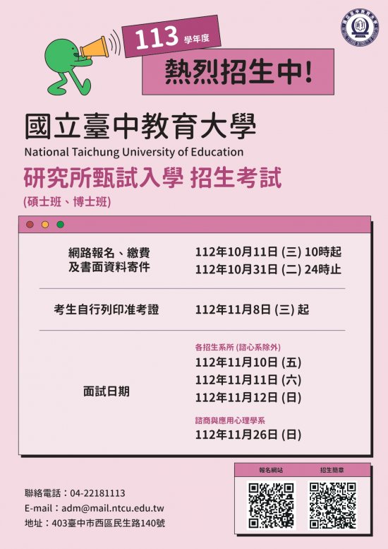 招生簡章自112年9月19日起於本校網頁/招生資訊公告,不另發售紙本簡章,考生可自行由網頁查詢或列印。本校招生資訊網頁: https://as.ntcu.edu.tw/ |
