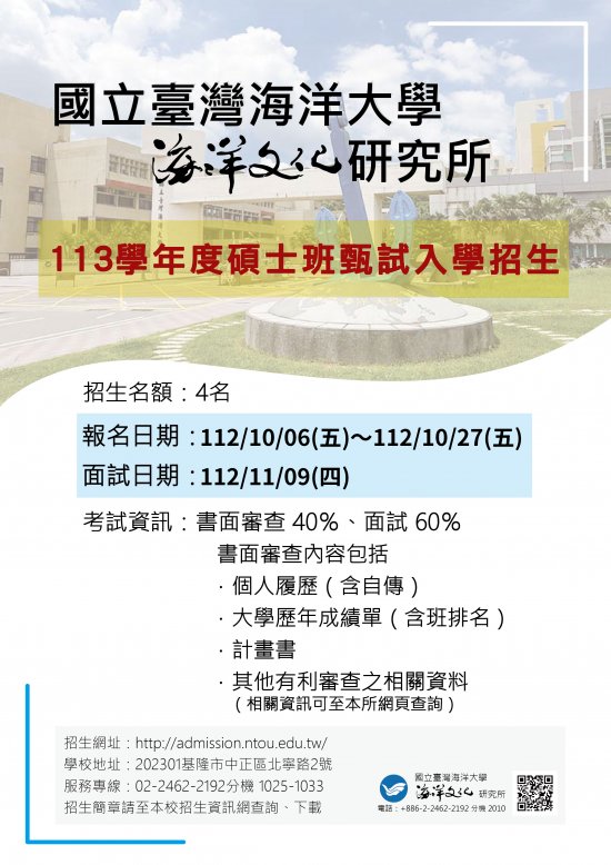 | 113學年度碩士班甄試入學招生考試相關資訊如下: |