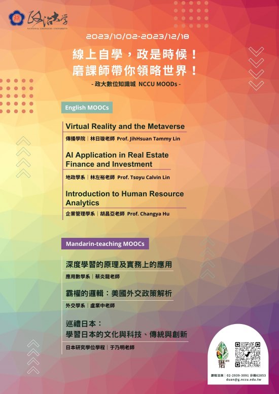 | 一、 | 國立政治大學自112年10月2日起於政大數位知識城平台上開設6門課程,即日起開放線上註冊報名。網址:https://bit.ly/3PGcEDo |