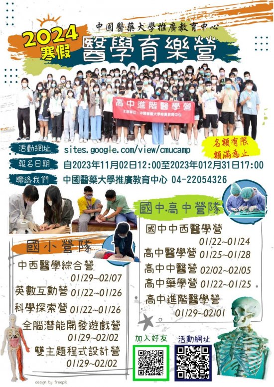 2) 中國醫藥大學推廣教育中心於113年1月22日到113年2月7日寒假期間辦理『高中、國中、國小醫學營及各類主題營隊海報.jpg
