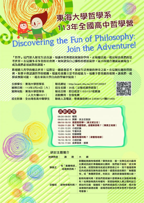 | 一、 | 本哲學營活動全程免費,名額為25名,歡迎提早報名以免向隅。報名網址:http://event.ithu.tw/2019120007。 |